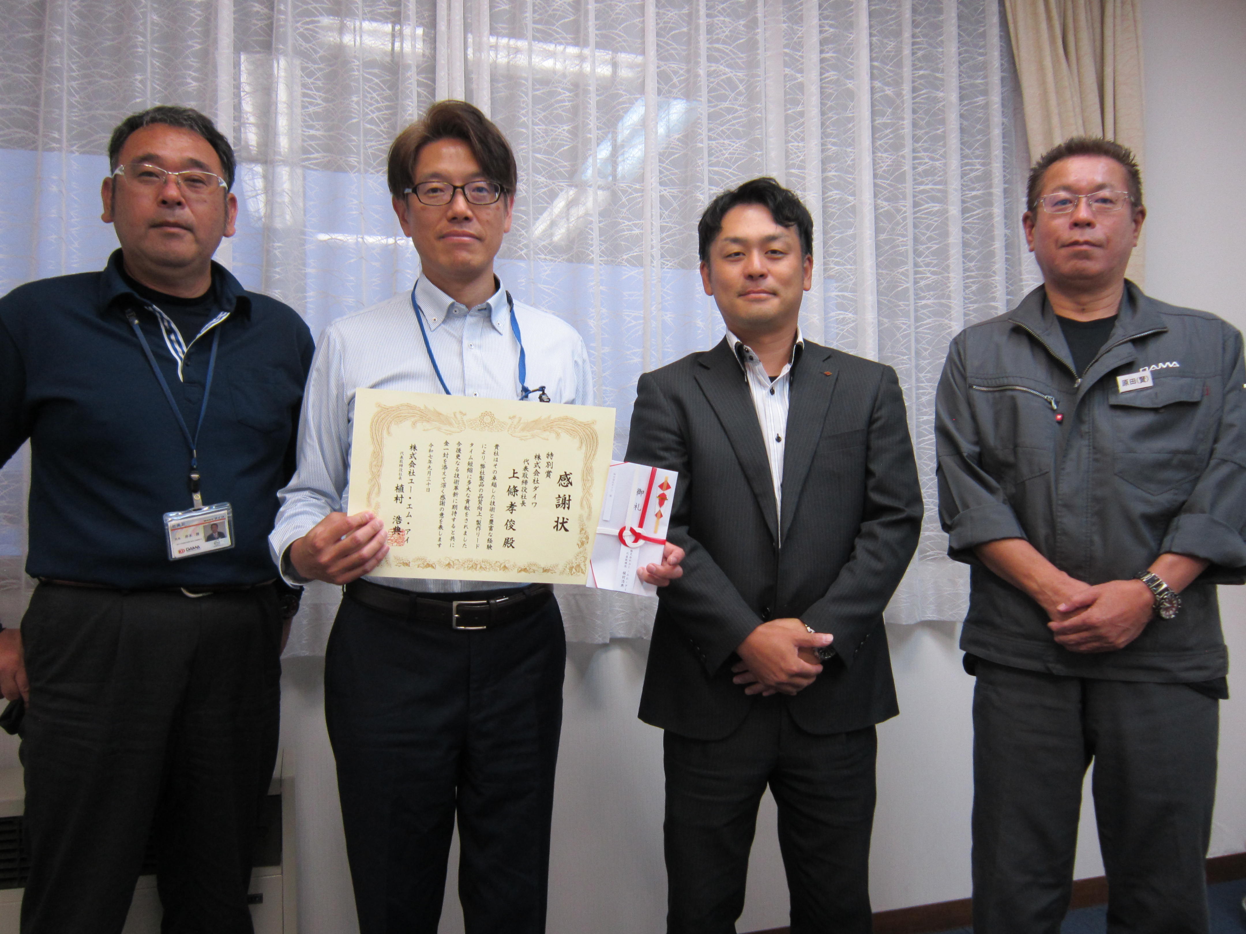 当社で加工しております製品の品質はもとより、価格や対応に関して評価をいただいての感謝状授与です。